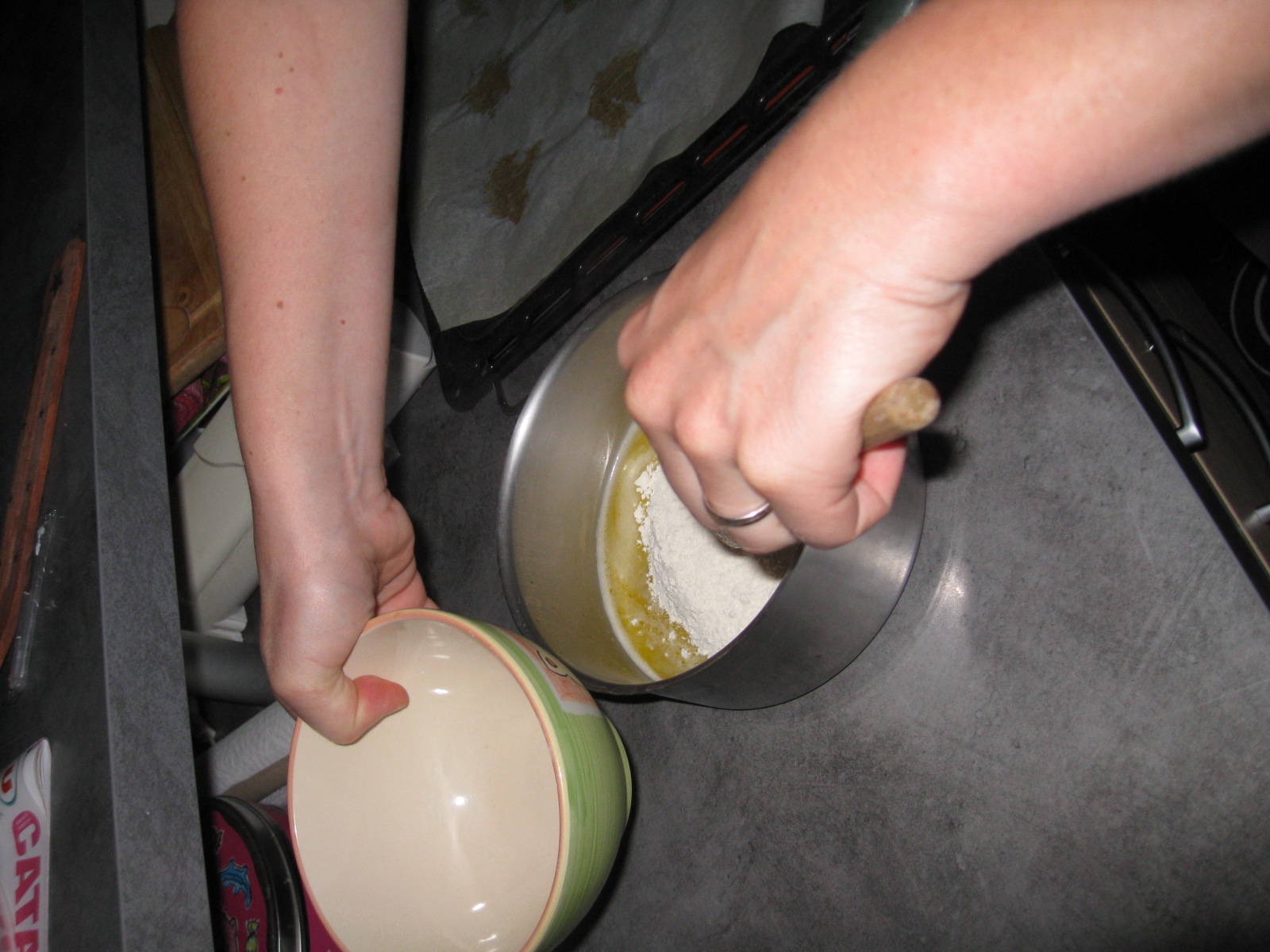Retirer du feu et verser toute la farine d’un coup dans la casserole. Choux au fromage - Etape 2