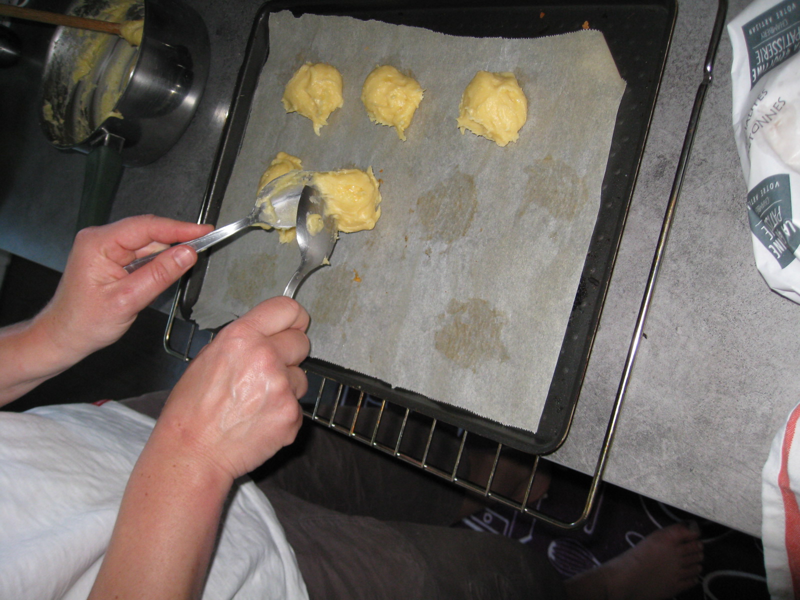Disposer sur une plaque avec papier sulfurisé en petite boule à l’aide de deux cuillères à soupe. Choux au fromage - Etape 6